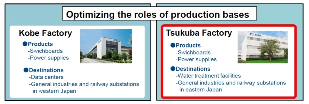 Meanwhile, the company will also work to optimize the roles of production bases at the Kobe and Tsukuba Factories. The Kobe Factory manufactures switchboards and power supplies for data centers, general industries (e.g. factories, commercial facilities), and railway substations, and the Tsukuba Factory for general industries, railway substations, and water treatment facilities. The production of general industries and railway substation products will be allocated to one of the two factories according to the destination.