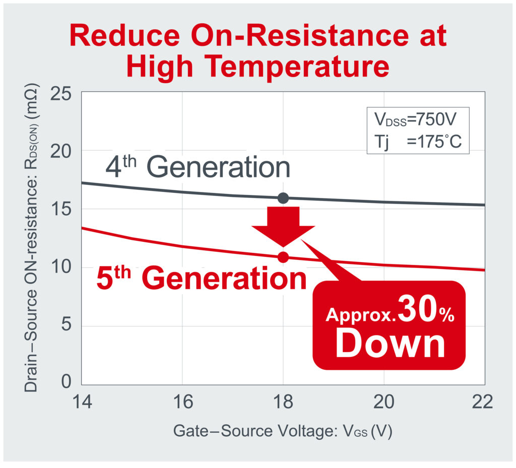 The newly developed 5th Generation SiC MOSFETs achieve industry-leading low loss, driving the broader adoption of SiC technology. Through structural enhancements and manufacturing process optimization, ON resistance is reduced by approximately 30% during high temperature operation (Tj=175°C) compared to conventional 4th Generation products (under the same breakdown voltage and chip size conditions). This improvement contributes to making units smaller while increasing output power in high temperature applications such as traction inverters for xEVs.